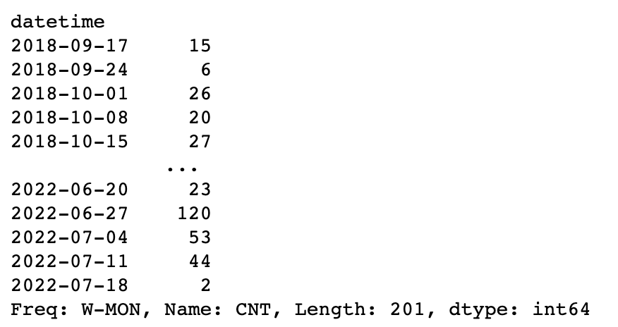 resample 함수에 옵션 'W-MON'을 설정하고 CNT 칼럼을 합계하여 월 단위로 데이터 개수를 카운트합니다.
