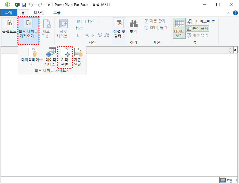 아래의 그림 11과 같이, PowerPivot 윈도우의 상단 메뉴바에서 '외부 데이터 가져오기' 버튼을 클릭하고, 그 하단에 '기타 원본' 아이콘을 클릭합니다.