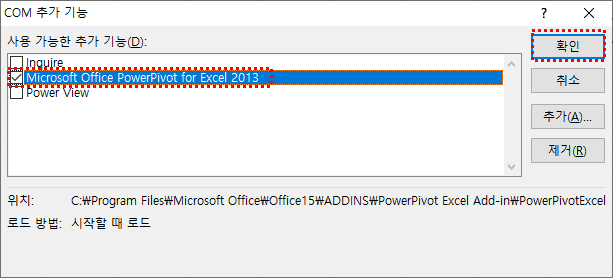 아래의 그림 9와 같이, 'Microsoft Office PowerPivot for Excel 2013' 기능을 체크하고, 우측에 '확인' 버튼을 클릭합니다.