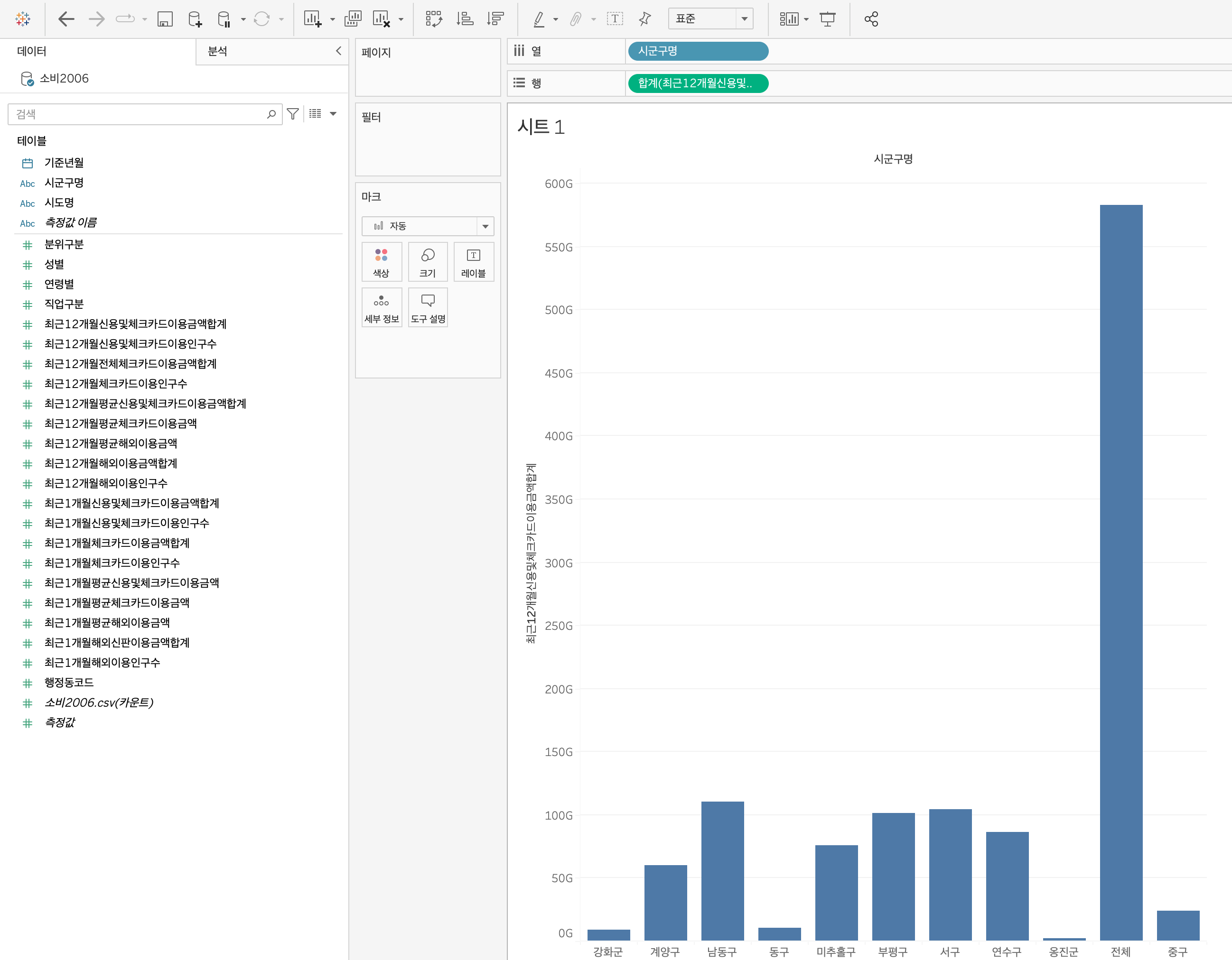 위의 그림 3과 같이, 차원인 '구/군'에 따라 측정값인 '카드이용금액합계'가 분류되는 것을 확인하실 수 있습니다. 이 차트만 보면, 남동구가 가장 카드 이용금액이 큰 것을 확인하실 수 있습니다.