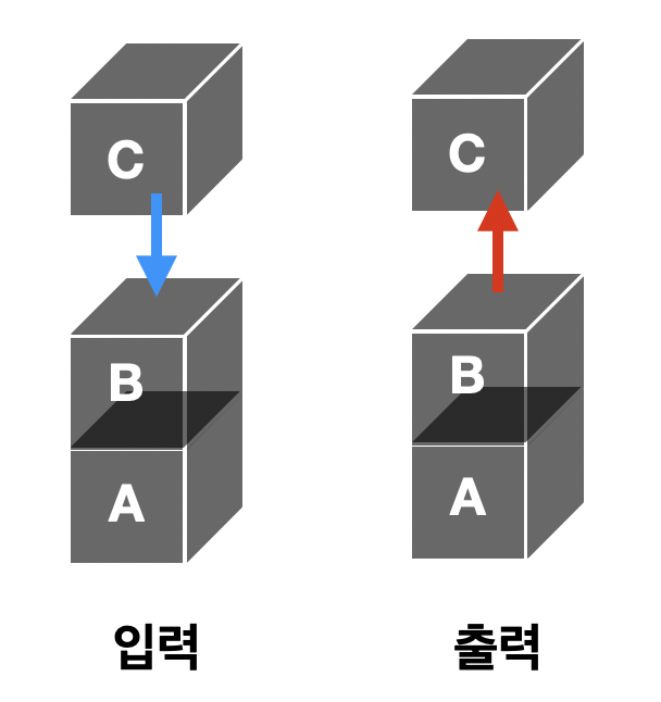 이제 스택 자료구조의 동작 방식을 살펴보겠습니다. 스택 자료구조는 그림 2 와 같이 입구와 출구가 동일한 형태로 표현됩니다.
