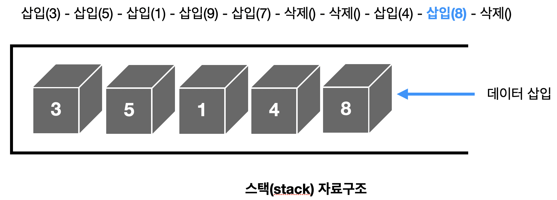 스택 자료구조는 먼저 들어온 데이터가 늦게 나가는 형태의 자료구조로서 선입후출(先入後出) 방식입니다. 스택 자료구조는 아래의 그림 1 과 같이 입구와 출구가 동일한 형태로 표현할 수 있으며 "박스 쌓기"를 연상하시면 기억하기 편합니다.