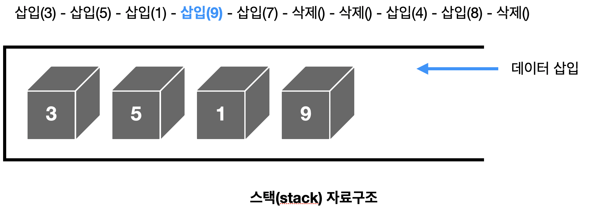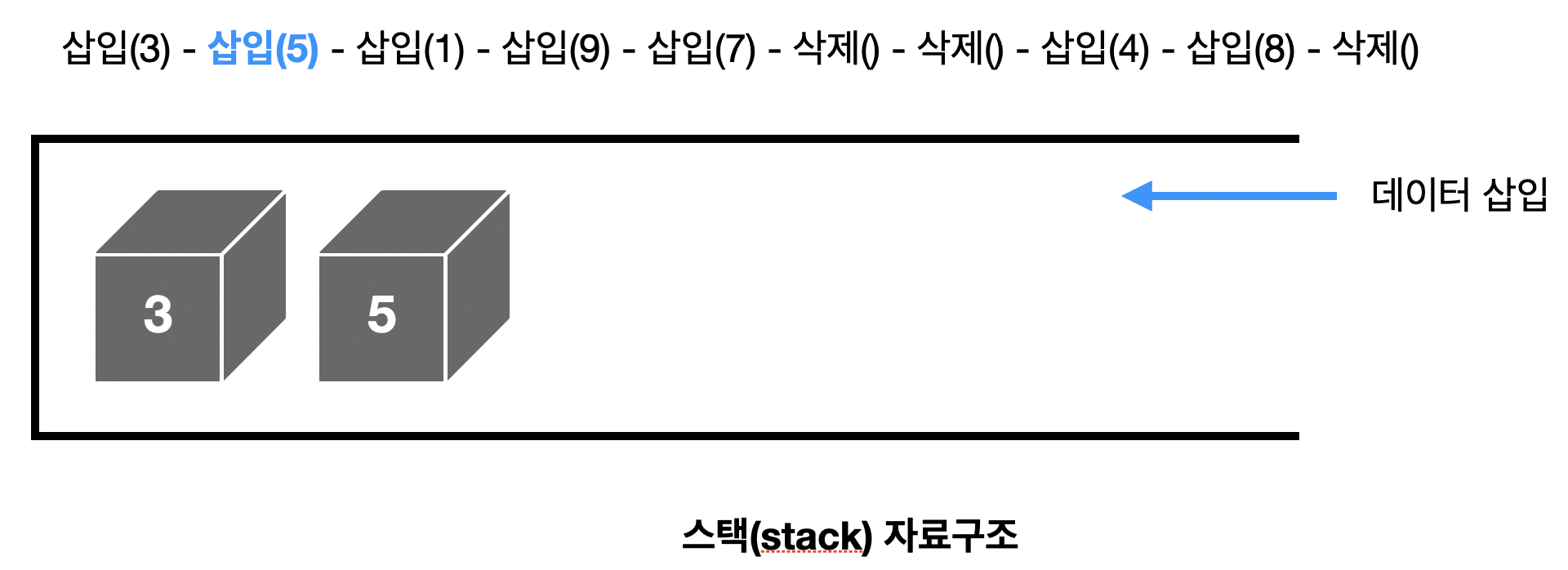 그림 3 상단에 적힌 스택 자료구조 연산이 좌측에서 우측 순서대로 진행되는 예시를 살펴보겠습니다.