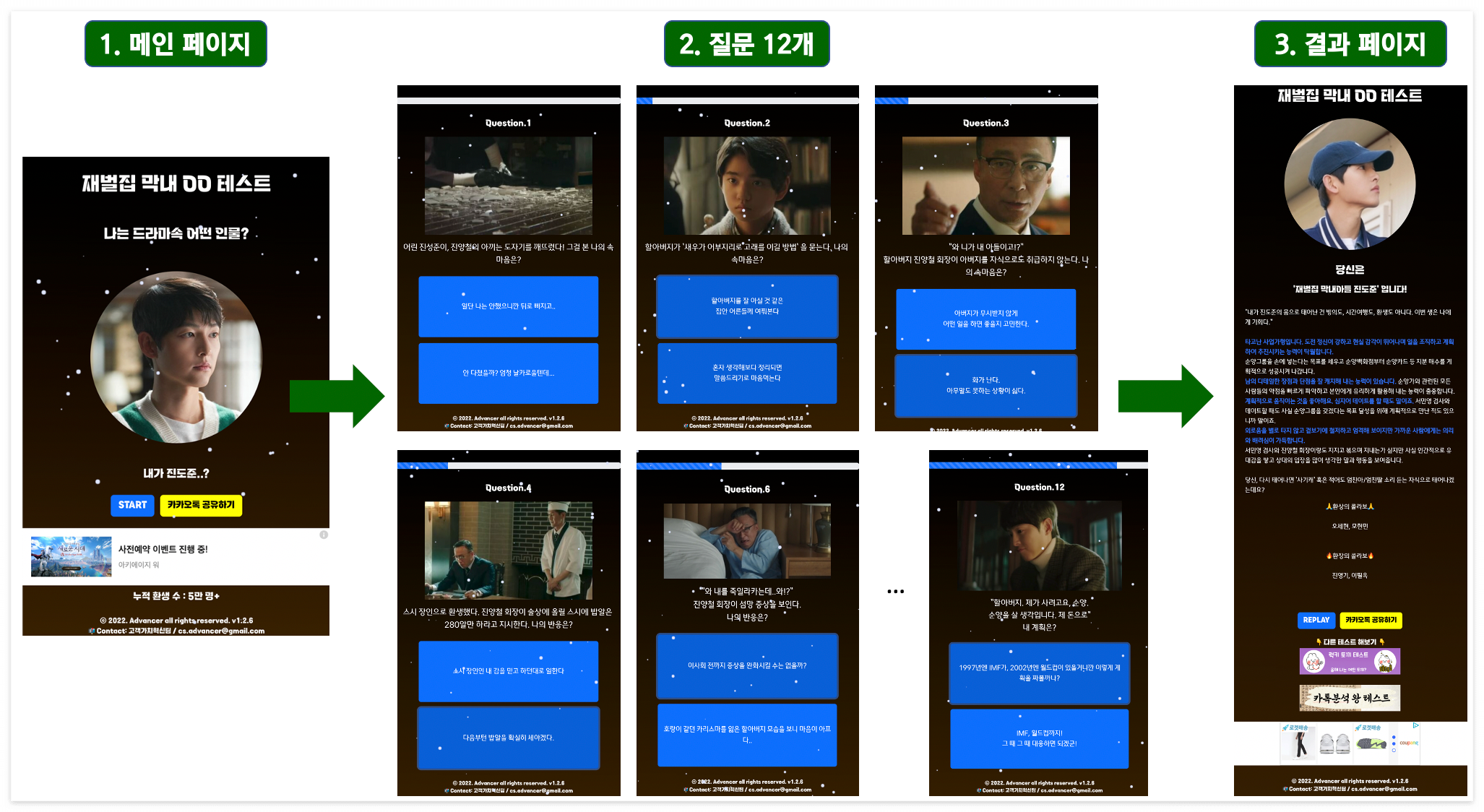 서비스 흐름도는 위의 그림 2와 같습니다. 페이지는 크게 메인(home) 페이지, 질문/답변 페이지, 결과 페이지로 총 세 부분으로 나눌 수 있습니다. 메인 페이지에서 'Start' 버튼을 클릭하면 질문/답변 페이지로 이동합니다. 질문 12가지에 대해 차례대로 이지선다형으로 선택을 완료했다면 결과 페이지에서 본인 성격과 가장 유사한 드라마 속 캐릭터와 결과 풀이를 확인하실 수 있습니다.
