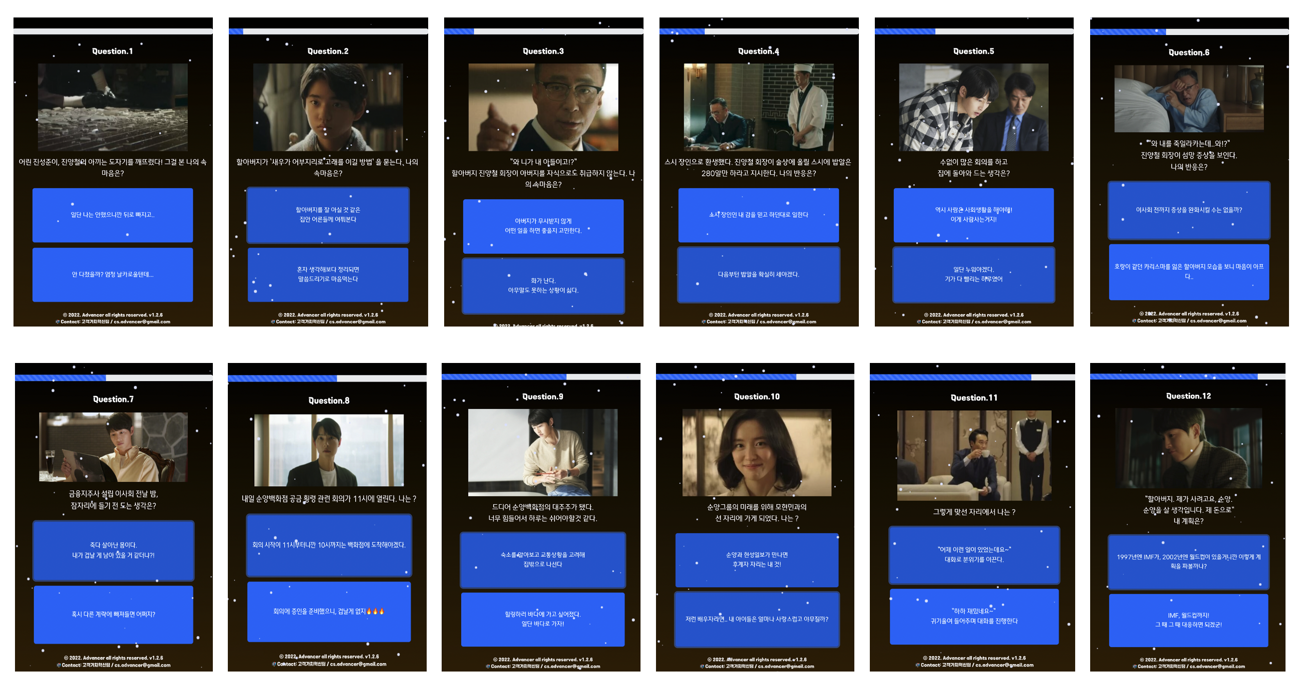 사용자가 더욱 몰입하고 즐겁게 답변을 고를 수 있도록, 질문 맥락을 고려한 드라마 속 장면을 활용하였습니다.