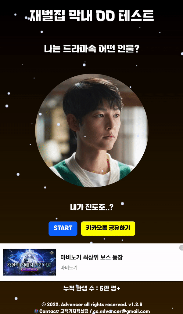메인 페이지는 위의 그림 3과 같습니다. 서비스 Identity를 보여주는 서비스 이름과 문구를("나는 드라마 속 어떤 인물?", "내가 진도준..?") 기입하였습니다. Start 버튼을 클릭하면 질문/답변 페이지로 이동하고, 카카오톡 공유하기 버튼을 클릭하면 카톡 공유창이 팝업합니다. 하단에는 현재까지 테스트한 누적 사용자 수를 환생한 수로 프레임을 씌워 개괄적인 수치로 제공합니다(i.e., 5만 명+).