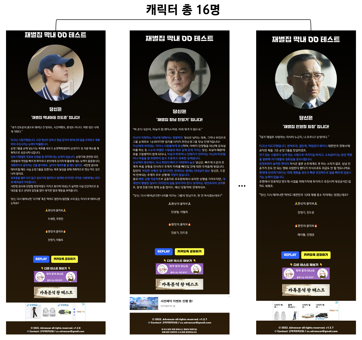 위의 그림 6은 결과 페이지입니다. 사용자의 답변 결과에 따라 총 16명의 캐릭터 중 한 명으로 맵핑하여 성격을 분석한 결과를 제공합니다. 드라마 속 해당 캐릭터의 스토리를 곁들여 성격적 특성을 분석하여 제공합니다. 파란색 글씨가 성격적 특징을, 흰색 글씨가 드라마 스토리에 해당됩니다. 드라마 속 인물 관계와 별개로, 성격적 특성만을 고려하여 성격적으로 궁합이 잘 맞는 캐릭터인 '환상의 콜라보' 명단과 궁합이 좋지 않을 '환장의 콜라보' 명단을 제공합니다.