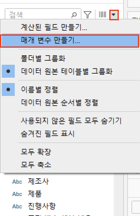 좌측 데이터 필드가 있는탭에 아래 삼각형 아이콘(▼)을 클릭한 후 '매개변수 만들기'를 클릭합니다 (그림 1).