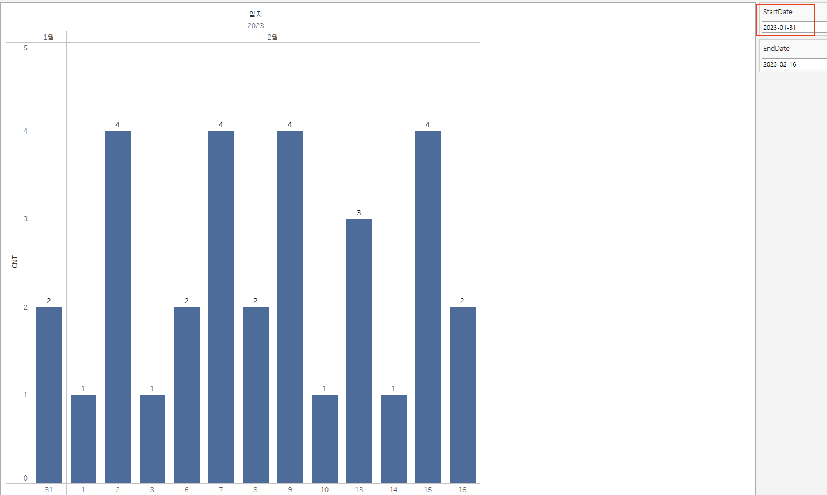 이제 실제로 입력하는 날짜에 따라 데이터가 조회되는지 테스트해봅니다. 아래의 그림 15와 같이, 조회 시작일을 1월 6일에서 1월 31일로 변경하자 해당 기간 내의 데이터만 표시되는 것을 확인하실 수 있습니다.