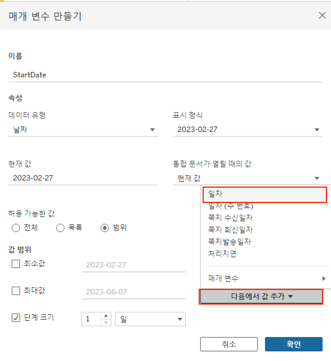 가장 먼저, 날짜 조회할 시작과 종료일 역할을 할 두 매개변수를 만들어 줍니다.
