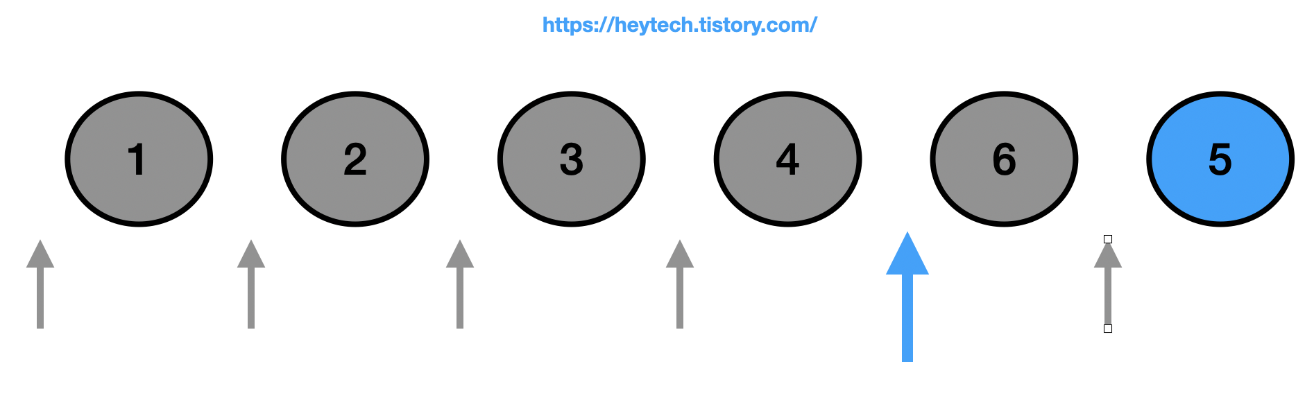 그림 1 과 같이 정렬 없이 정수 6개가 무작위로 배치되어 있을 때 삽입 정렬을 활용해서 오름차순으로 정렬해 보도록 하겠습니다. 편의상 삽입해야 할 데이터를 파란색으로, 정렬되어 있는 데이터는 회색으로 표현하겠습니다. 또한, 삽입하기에 적절한 위치를 파란색 화살표로, 삽입 가능한 위치는 회색 화살표로 표현하겠습니다.