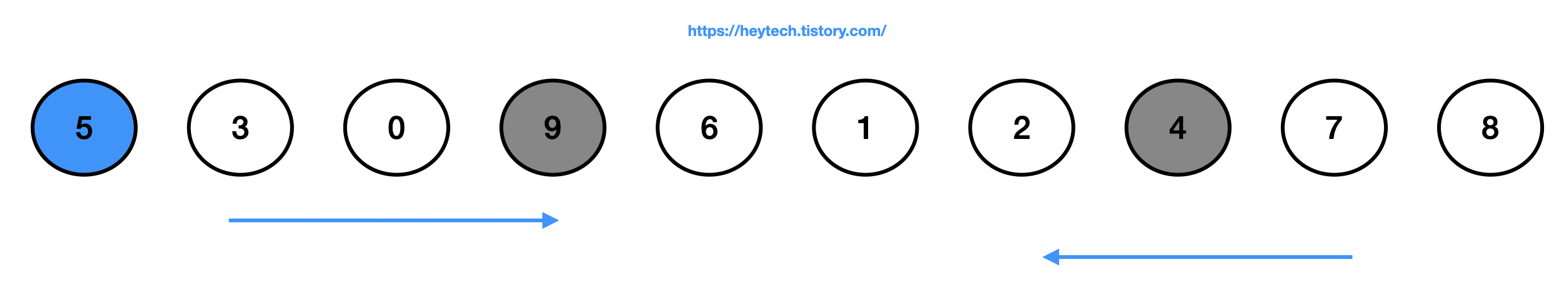 1️⃣ 리스트 좌측에서 우측 방향으로 피벗보다 큰 데이터를 찾고, 리스트 우측에서 좌측 방향으로 피벗보다 작은 데이터를 찾습니다.