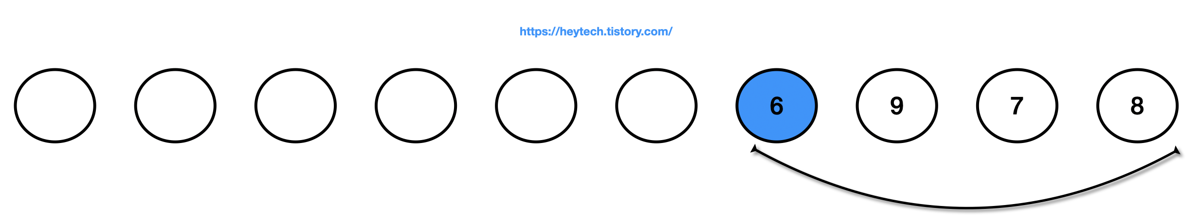 3) 데이터가 변경된 각 위치에서 다시 좌측과 우측 방향으로 피벗보다 작거나 큰 값을 찾으면, 피벗인 6보다 큰 값인 8을 찾았지만 피벗보다 작은 값은 찾지 못 했습니다. 따라서 8과 7의 위치를 서로 변경합니다.